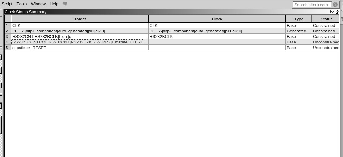 i have got a problem with the timequest Analyser tool. In the following code you can see my first test of the RS232 Interface. It works but if i start the timequest tool, the timequest tool said: RS232_CONTROL:RS232CNT|RS232_RX:RS232RX|l_mstate.IDLE~1 is a clock. But it isn't a clock. Whats happen? could you please help me?