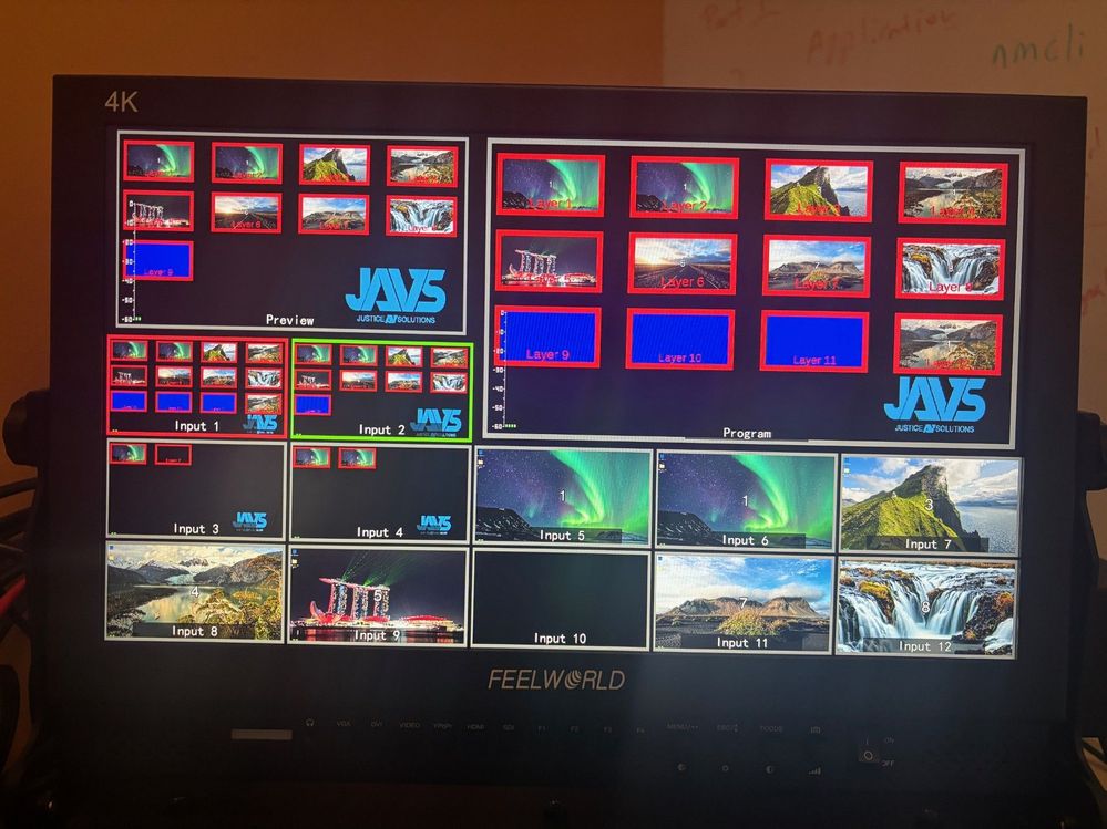 The missing_input_example.jpg provided shows how mixers 1,2, and 4 have all the inputs, but for some reason the second input on mixer 3 is out. Do not worry about duplicate inputs or the blue screen inputs, I am just doing that for testing.