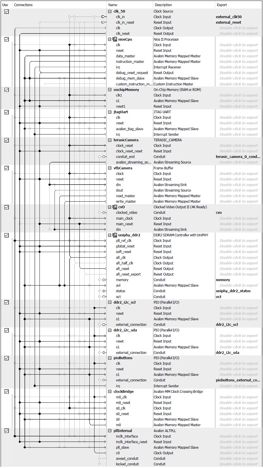 I am of course no vice specially in timing the design. Kindly refer to the snapshot of my qsys system. This is in short a video capture system using D5M CMOS camera on DE-4 board. Video capture works pretty fine. The problem I face is in Software side and not in Hardware side. I mean in NIOS eclipse environment with C language, when I press pioButton have no effect i.e. code which is expected to run is not running. But when I press Hardware reset, very quickly after pressing reset the pioButton works fine. And as soon the video capture is started and getting displayed again on screen, the pioButton again goes like dead. in simple words video capture + display is working like mutually exclusive with piobutton. either of these two may work. once video capture is started piobutton have no effect. All the connections are very well clear in snapshot. Other details: DDR2 memory device speed grade is 533.333MHz; in general settings speed grade is 2; Memory clock frequency is 400MHz; PLL reference clock frequency is 50MHz; then you may see afi_clk is connected to all IPs except PIOs which are connected to 10MHz clock derived from pllInternal alt_pll IP. Avalon MM-Clock crossing bridge master clock is connected to 10Mhz from alt_pll and slave clock with afi_clk of DDR. my question is: Is there any necessary IP I must use to synchronize the events of PIOs and camera module (inculdes IPs Terasic_Camera, FrameBuffer, and Clocked Video Output)? Or clocks distribution I am providing is wrong? NOTE: C language code have no problem as I have tested the code running smoothly when after removing the Camera module which means disabling the camera and video capture gives no problem in Software at all. Thanks a lot in advance. Snapshot is below: https://alteraforum.com/forum/attachment.php?attachmentid=15590&stc=1