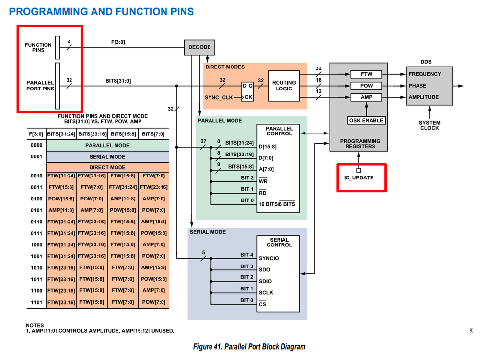 When DDS is in parallel mode (selected via F[3:0]=0000) the interface is asynchronous and everything works just fine.