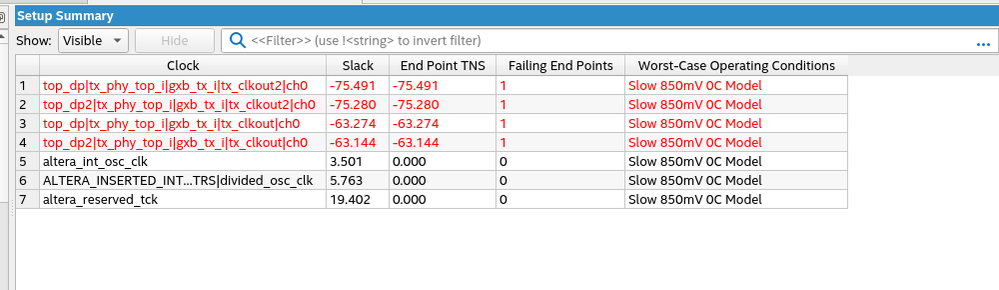 I have generated an example design for display port which compiled successfully. As we are dealing with 2 display ports i made a second instantiation of the same example top. this time i got a timing violation in the following path, which I could not solve. But the project is working fine when I test in the board. Can you please help me to solve this timing violation?