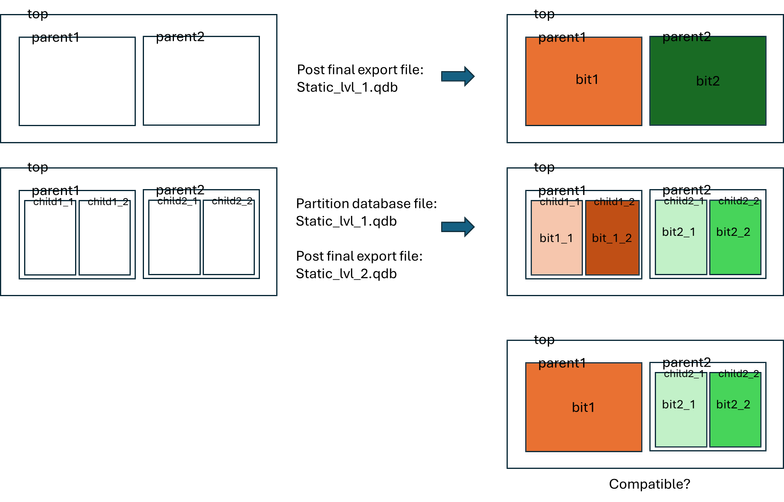 Still not clear. The file you're calling static_lvl_1.qdb: is this for the top-level static logic generated from the base revision or is that the .qdb for either parent1 or parent2? If it's supposed to be for the top-level static logic, then it has nothing to do with the logic contained in parent1 or parent2.