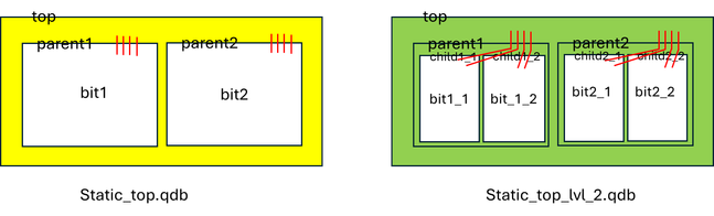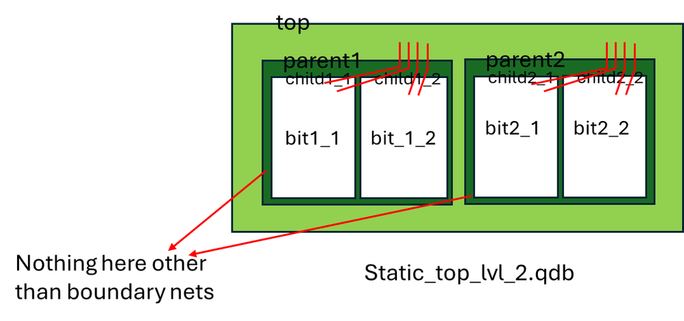 Sorry for the confusion. So, static_top.qdb is highlighted in yellow below. It has boundary nets(red) from the top level to the parent1 and parent2.