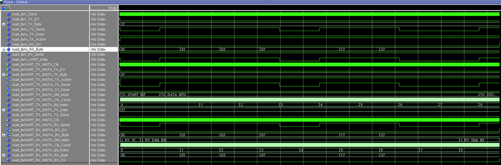 Make appropriate connection between o_TX_Serial and i_RX_Serial to form a loopback. The simulation result like below: