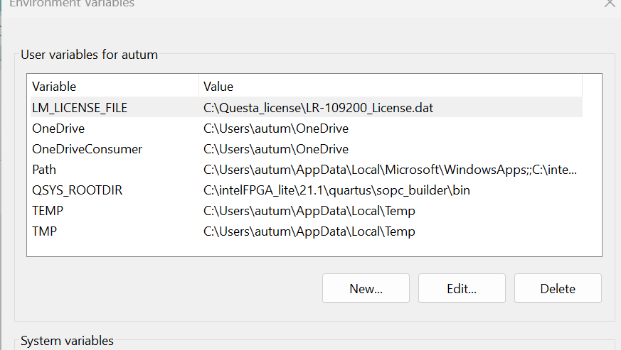 Hi. I have requested and downloaded the license needed to run simulations on questa however, when I try to run simulations I receive this error below. When I run it in my command prompt, it shows that the license file is found. I have edited my environment variables to also have the license and match. I also set up my Quartus with the license file, using questa as the simulation tool, and making sure my EDA is set to the questa win64 folder. I am not sure what to do at this point.