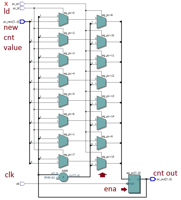 awesome. thanks all. greatprocess(clk, rst) variable sig_pc : unsigned(n downto 0); begin if rst = '0' then sig_pc := (others => '1'); elsif falling_edge(clk) then if pc_en = '1' then sig_pc := sig_pc +1; if pc_ld = '1' then sig_pc := unsigned(pc_new); end if; end if; end if; pc_out <= std_logic_vector(sig_pc); end process; - Altera_Forum