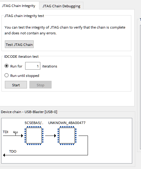 I am running Quartus 16.1 standard on Windows 10, and have been debugging my firmware with SignalTap II connected through the USB-Blaster. This has worked fine up until last night when it could no longer find the device. I've tried different boards, I've tried a different USB blaster. Nothing works. If I go to the programming tool and debug the JTAG chain it shows the expected device (Cyclone V SX) and an unknown device. It seems to be misreading the SOC? What could have changed? I've tried installing v20.1 but that USB Blaster driver won't install.