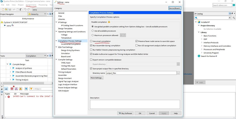 I'm using Quartus Prime Lite Edition 18.1, however the issue persists also with 18.0. The "Use smart compilation" is greyed out and cannot be enabled.