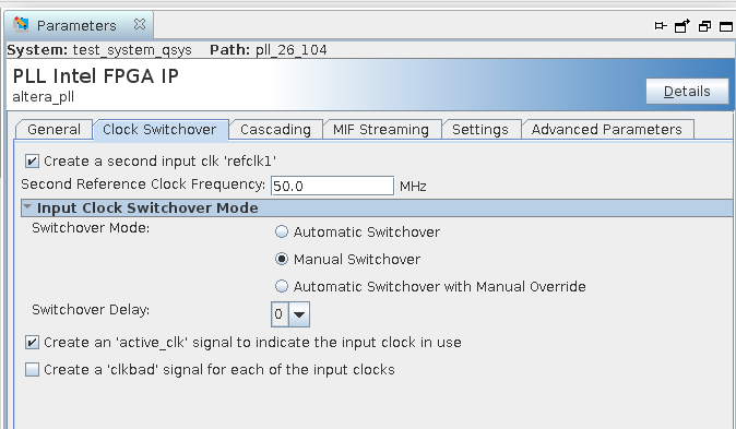 Now the two clock pins already pass through the clock_source IP blocks on the way to the PLL. The PLL has 2 reference clocks in which I have programmed "manual" switching. No matter which clock I put on refclk1 I get the same warning and the result is the second clock is NOT PRESENT at the input of the PLL after fitting as examined in the technology view.