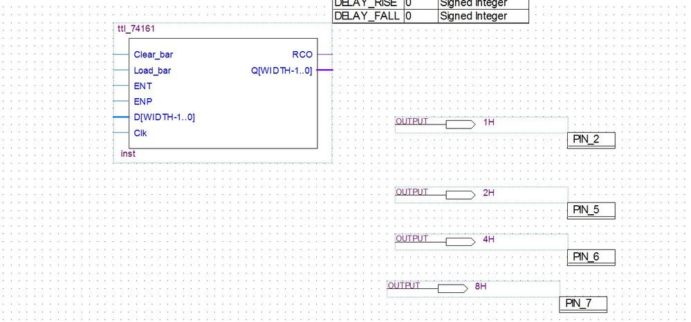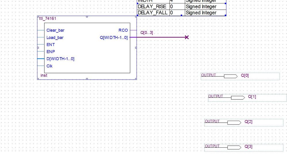 I need to implement a 4-bit counter (74161) in my schematics, I found a Verilog example but I'm unable to properly wire the symbol because it uses bus for inputs and outputs.Specifically I need to label the outputs in a certain way (because they are outputs from the CPLD and they must be labeled as H1, H2, H2, H4) while the four input must be tied to GROUND.How can I obtain this?