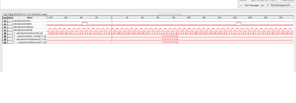 My project is to convert an analog signal to digital, and I’m using the DE1-SoC ADC for this purpose. I’m trying to achieve this using the code from this video, but despite using the same code as in the video, my dout value always remains constant, and therefore my dataout value does not change. How can I solve this?
