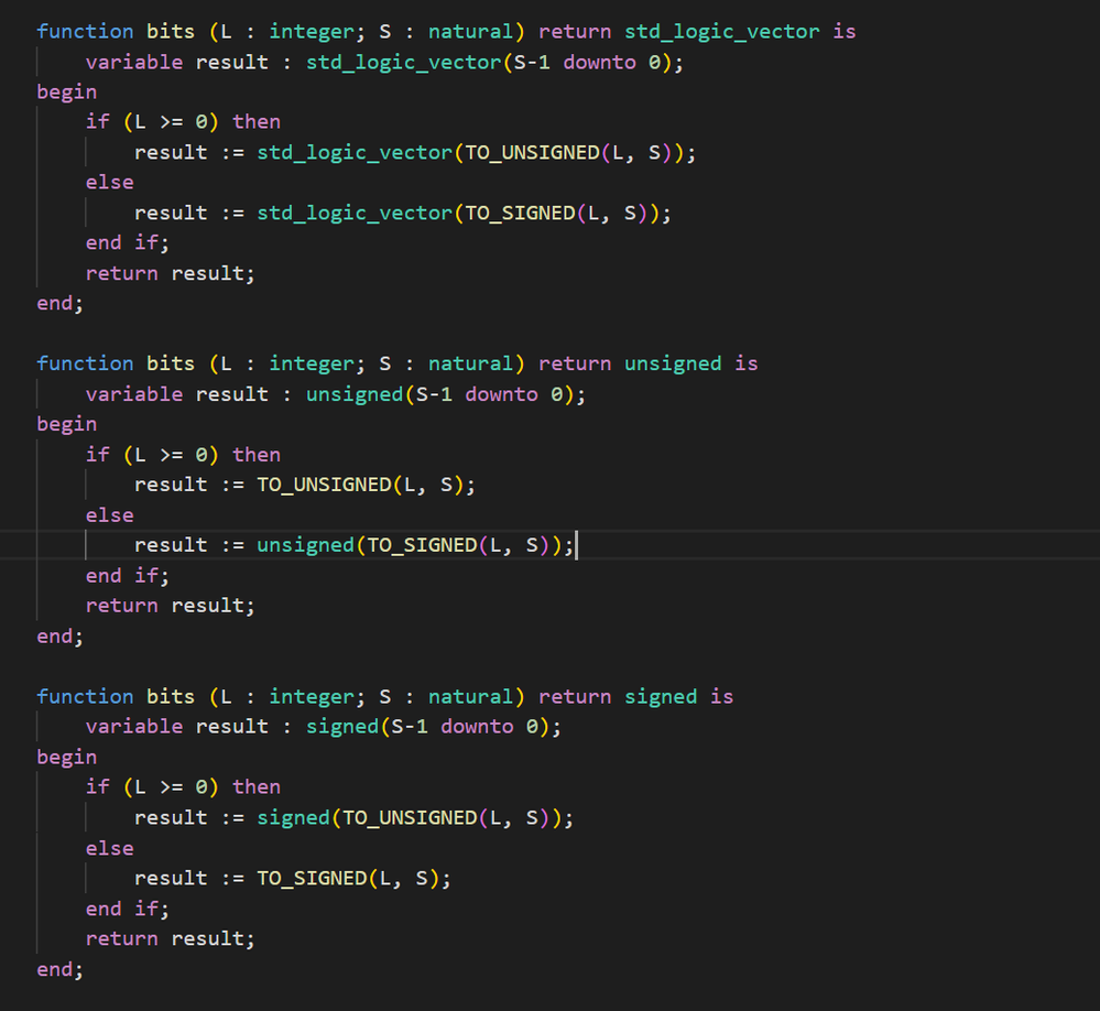 bits(integer, size of result reg) return signed | unsigned | slv