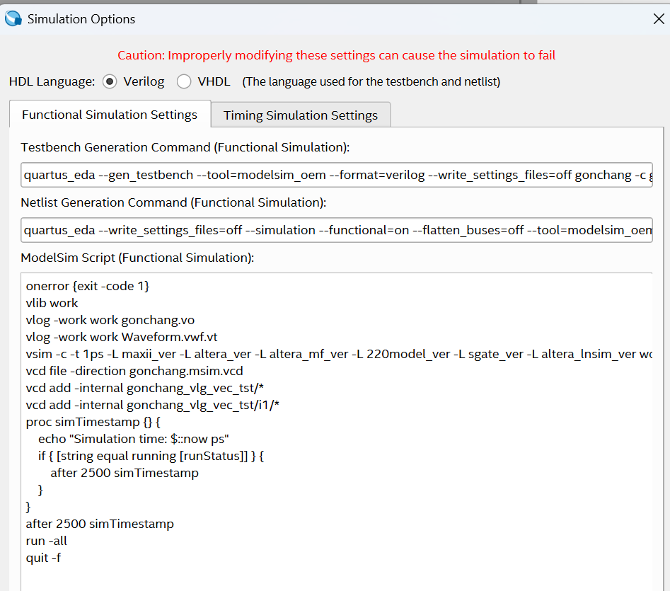 Hello, when I was simulating on Quartus Prime Lite, my project required using VWF to simulate waveforms, but I received an error vsim-12110. I have also searched for solutions, but the solutions suggest removing the -novopt text. However, when I used it, the simulation worked but produced a bad result where the output equals the input, which prevents me from simulating. Additionally, all the solutions from the forums have been ineffective.