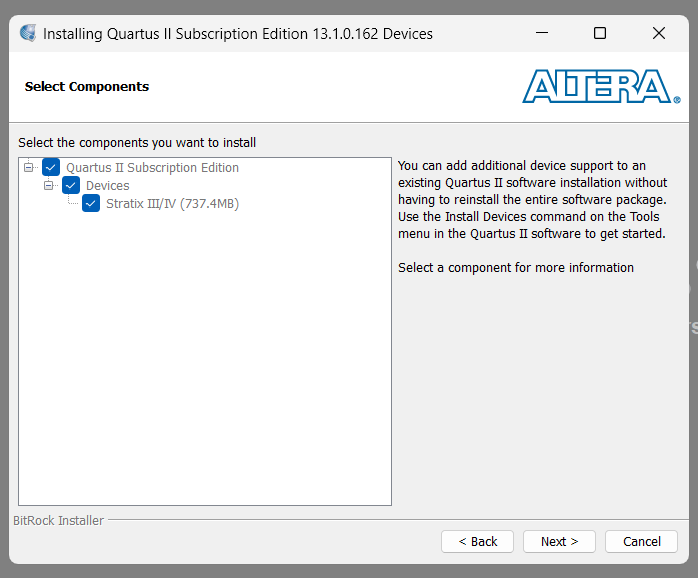 The Quartus II Subscription Edition does list Stratix 3, but when I downloaded it, it asked for a license, which I don’t have.