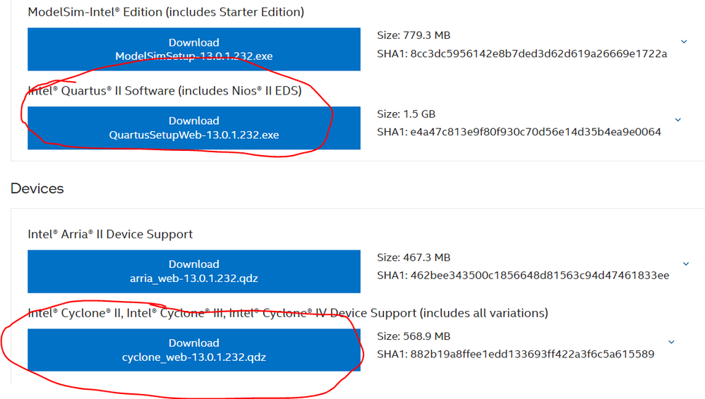 you are confusing versions. 13.0.1 is 13.0sp1, you are showing device support info of 13.1You minimally need two installation files from "Individual Files" tab, QuartusSetupWeb-13.0.1.232.exe 1.5 GB and cyclone_web-13.0.1.232.qdz, 569 MB.