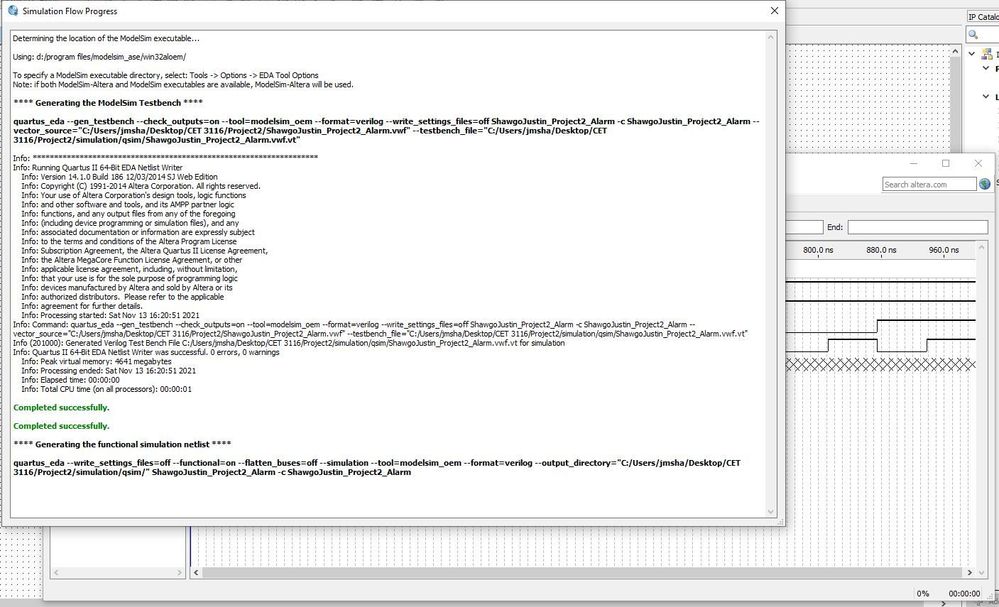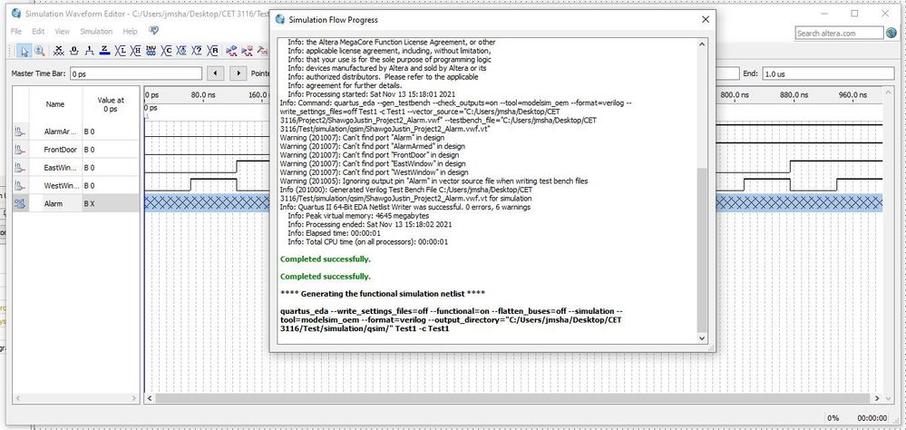 I have a course I'm taking that requires us to create a FPGA program and in the assignment we are asked to run the Waveform Simulator. I get through all off it, set my inputs to go high/low at the correctly desired times to simulate all combinations of 0s and 1s. When I attempt to run the Functional Simulation it just stops at a certain point and will not generate the 'report' so I can confirm my boolean truth table. I have attempted a lot of different things to get this to work and can't. Any help would be greatly appreciated.