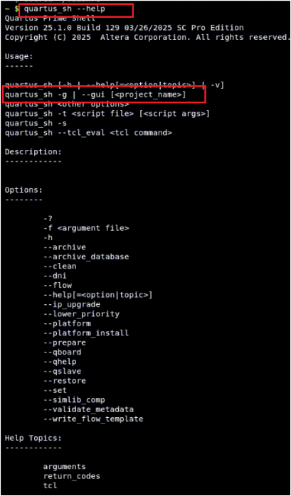 I want to run Quartus in GUI mode. Currently, we are compiling with Quartus in command line mode. The -g argument is supposed to launch the Quartus terminal in GUI mode.