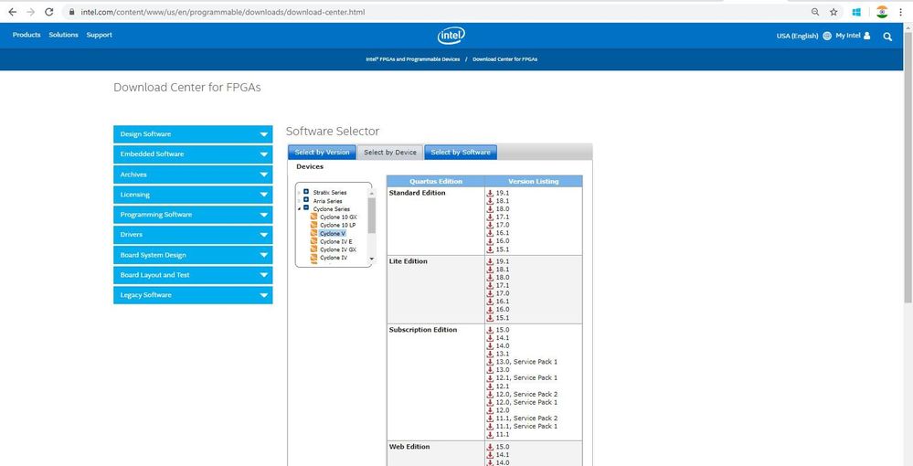It's difficult to screenshot as it's a link that doesn't do anything when I click it. I'm using this FPGA (https://www.terasic.com.tw/cgi-bin/page/archive.pl?Language=English&CategoryNo=205&No=816&PartNo=1) and following guide which says I need the Quartus II web edition v13 (or above I'm guessing). Honestly, I'd be happy with whatever software would be compatible with the cyclone V. I've tried multiple versions of the Quartus software and not one link has worked.