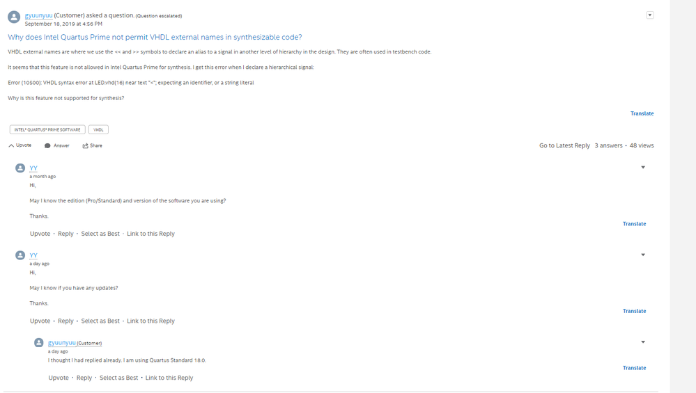 Have you tried to compile in the Pro edition? The Standard edition has limited language support for VHDL-2008. You may refer to https://www.intel.com/content/dam/www/programmable/us/en/pdfs/literature/po/ss-quartus-comparison.pdf.