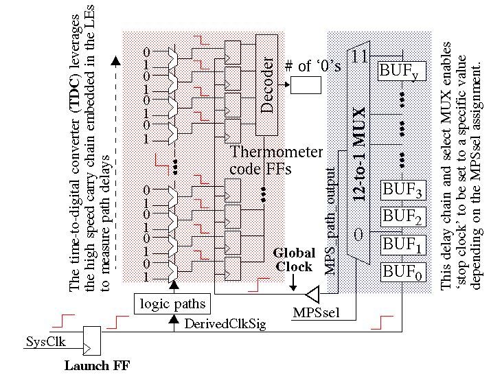 This is a diagram of the circuit that I would like to build initially. If I get this to work, then there are some other components I would add. This is a time-to-digital-converter (TDC) that uses the embedded, high speed carry chain to measure path delays along paths in the 'logic paths' block (not drawn to scale). The SysClk drives a register on the bottom left that 'launches' a rising edge into 'logic paths' block AND into the delay chain on the right. The 'logic paths' rising edge emerges and then propagates along the carry chain in the adder at high speed. The MPS_path_output drives the clock to the thermometer code registers (declared in Quartus as a Global Clock so the clock tree is used). Once the MPS_path_output goes high, the Thermometer code FFs stop sampling. The MPSsel control bits to the MUX allow different tap points to be selected along the delay chain to account for different delays along the paths in the 'logic paths' block. The idea is to set the MPSsel bits so that the edge propagating along the carry chain is still propagating when the MPS_path_output goes high. This way, you get a sequence of 0's followed by 1's in the Thermometer code FFs. Counting the number of 0's give a relative measure of the delay of the path in the 'logic paths' block that is being measured. In order for this to work, each of the adder cells and corresponding Thermometer code FF must be in the same LE, i.e., routing directly from the LUT to the FF input, and not through a randomly placed buffer as it is doing.