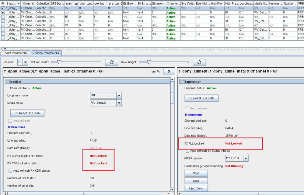Thank you for your response. Currently, my clock is locked. However, when I click TX PRBS Start, followed by RX PRBS Start, the RX PRBS stops almost immediately, and the Message window displays:verflow condition detected.