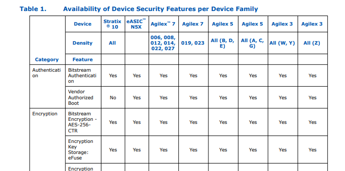 I have found in the agilex 5 product table that some variants are equipped with Cryptographic services and some not.