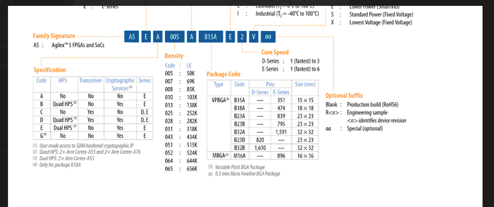 For the other two devices you showed, you should look at the Agilex 5 C column for the first one and the Agilex 5 B column for the second device (using the 4th digit again) in the document I linked above.