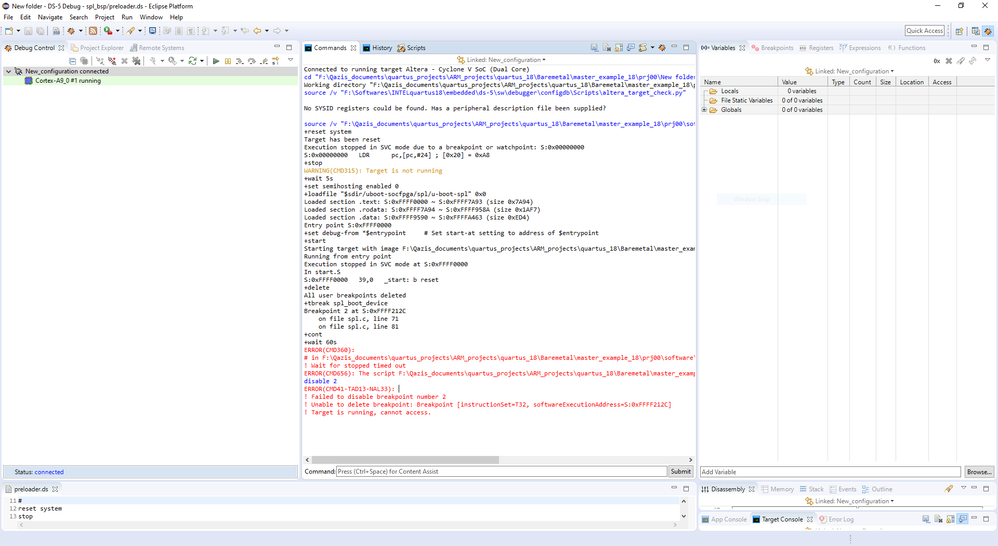 ERROR(CMD656): The script F:\Qazis_documents\quartus_projects\ARM_projects\quartus_18\Baremetal\master_example_18\prj00\software\spl_bsp\preloader.ds failed to complete due to an error during execution of the script
