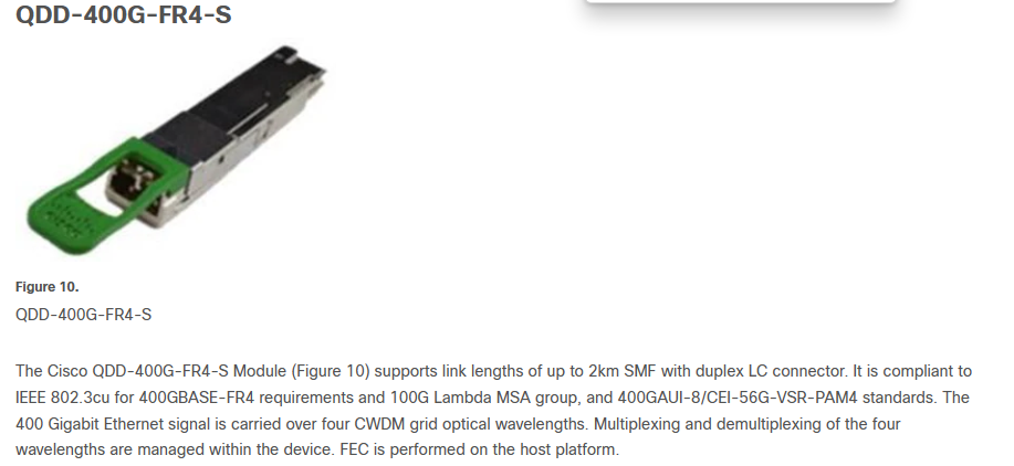 QSPFDD 400G光模块使用的是思科的QDD-400G-FR4-S,如下图所示:
