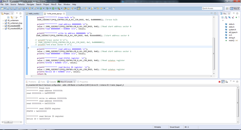 I am trying to access in read and write my EPCQL-1024 from simple soft running in NIOSII. I have the Altera Serial Flash Controller I configured in QUAD mode connected from its avl_csr and avl_mem to the NIOSII. I have tried to access in read and write the EPCQL registers (STATUS, Device ID) and the controller registers FLASH_ISR, or FLASH_IMR, it have been successful. But when I need to erase sector or write to memory. Here lies my problem; I can run nothing on board until power off. When reading the values back from the EPCQL or execute a simple access , it seem to return erroned values. I also tried reading the status register to see if there are processes occurring, but it always reads 0x0. Also when I try to read either the FLASH_ISR, or FLASH_IMR, the EPCQL seems to stop responding and I need to repower the chip then reload my .sof , the read data are correct. I am not sure where to start debugging this and if t's by definition, a flash memory needs a power off after each write operation, then how to write many data at a time to same or different sectors. Any help or points in a direction would be much appreciated.