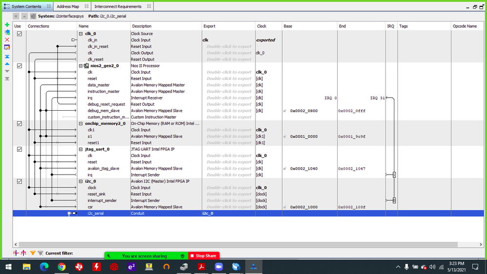 I am using cyclone VE development kit for to interface eeprom over i2c interface. I want to perform read/write operation on it. I tried to configure the i2c(master) intel fpga ip with nios2 processor and generate the code but i am facing some issue.
