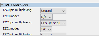 For I2C1 (0xFFC05000) in the Qsys we have set the multiplexer as (I/O Set 0) . The pin mux table and assignments have been thoroughly verified against our schematic, yet we see no activity on the bus