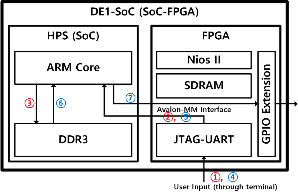 3. I'm currently stuck at the ⑤ since I don't know how to access the data to SDRAM from the FPGA side, which data bus is currently connected to multiple Avalog-MM masters at NIOS II and AXI master at HPS. I'm trying to add a DMA controller at the system configuration and connect the read_master to the data bus, but I'm not sure about the desired operation. Are there any demos or examples that I can refer to?