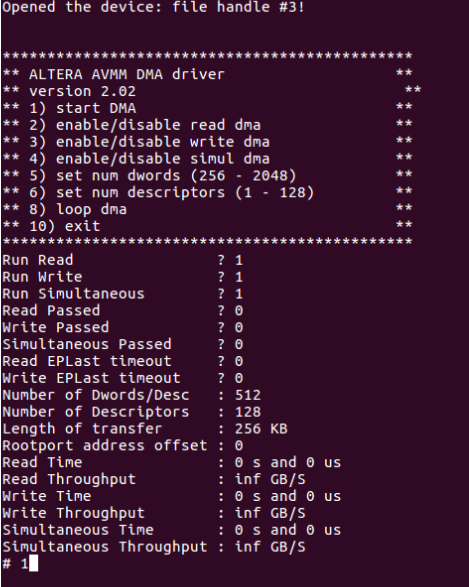 As soon as I "Start DMA" by entering '1' and 'Enter' the application and the Linux OS stops responding.