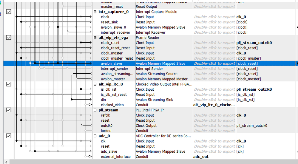From the demonstrations in the CD, I modified the hardware project and added ADC controller for DE series boards to the Qsys project like this: