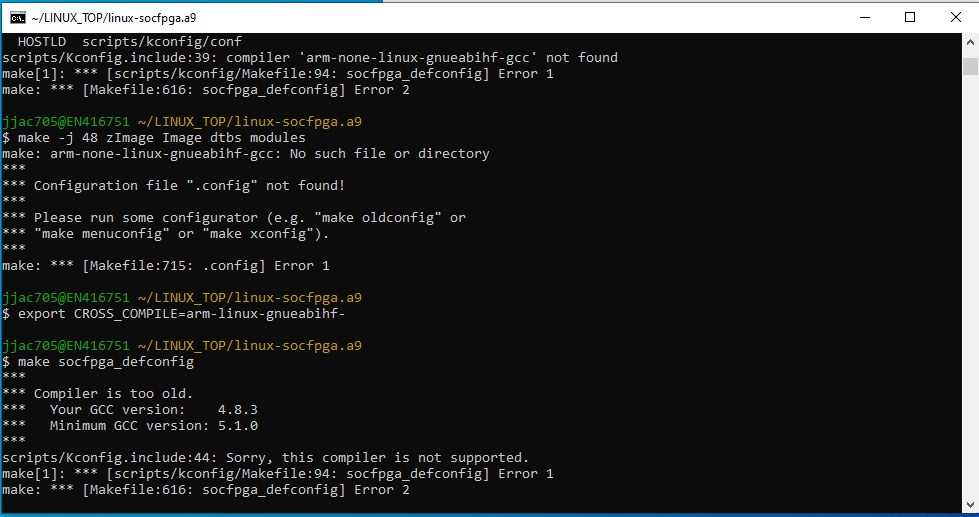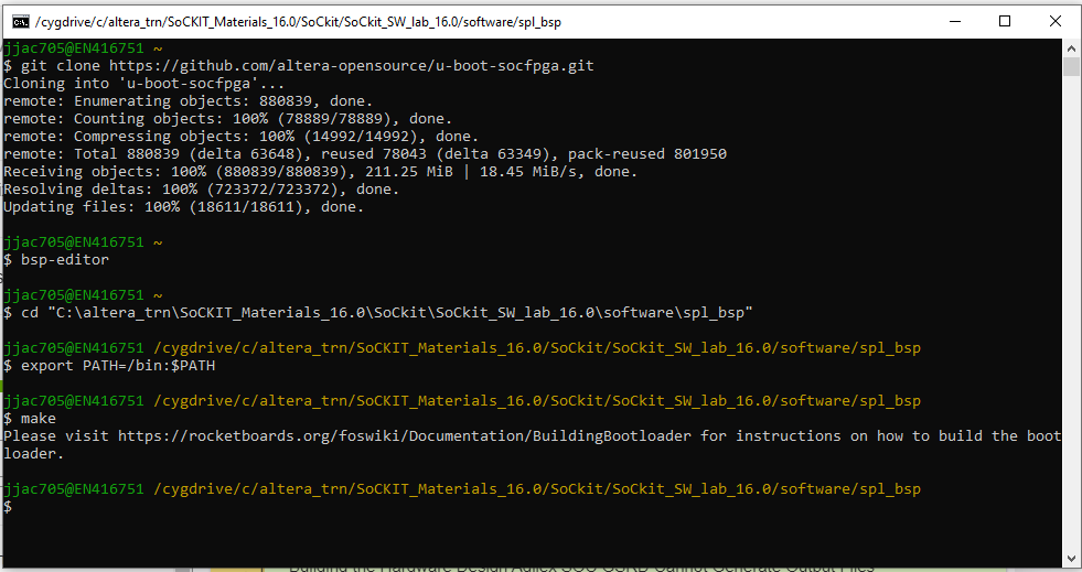 I attempted the SoC EDS as per the pdf SoC_software_lab_16.0.pdf on rocketboards.org. I was asked to see the link to create a u-boot-socfpga. In that, it was told to clone a github file which I did but when I tried to use the command 'make', I get the same issue again and again.