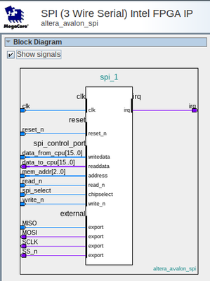 BessemNew Contributor4 years agoSPI (3 Wire Serial) Intel FPGA IP I am using de1-soc in order to read analog inputs from ad7324 which has an SPI interface. I can't see the addresses of this SPI ( data_from_cpu, data_to_cpu, mem_addr, read_n, spi_select, write_n) i...Show More