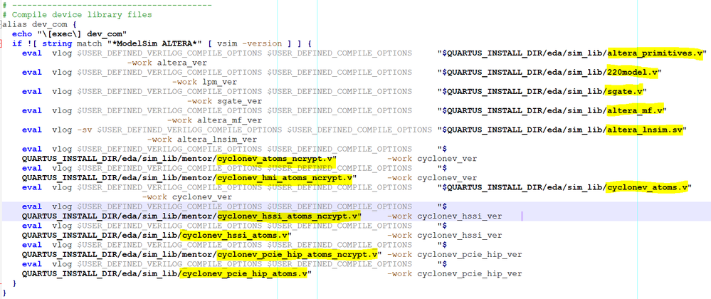 For example, to simulate a Cyclone V PLL IP in Modelsim, the script (msim_setup.tcl) compiles and use device related files as shown in the figure below: