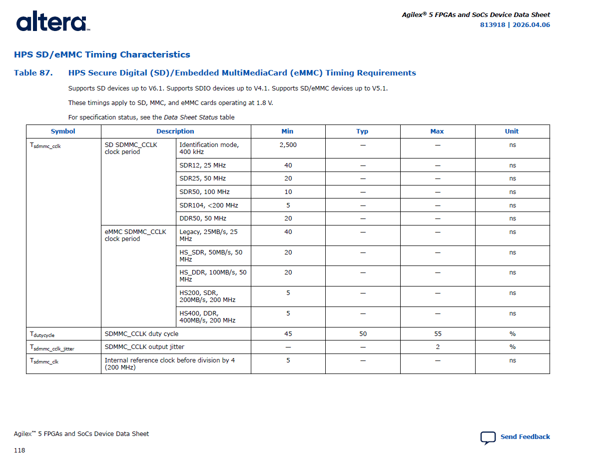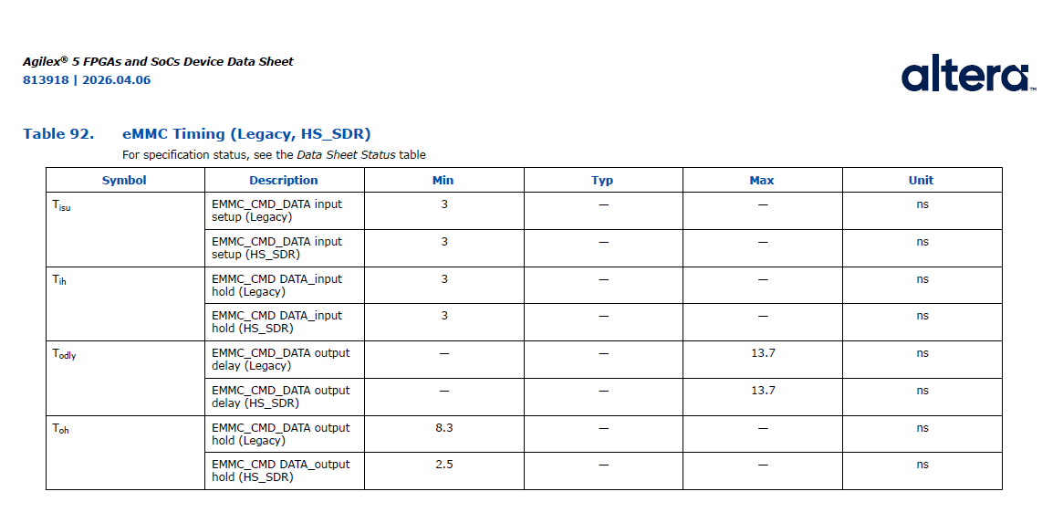 latest datasheet of SoC « 813918/2026.01.05 » lists in paragraph « HPS SD/eMMC Timing Characteristics » the constraints of eMMC, applicable to memory component but does not define any timing data in input/output of SoC.