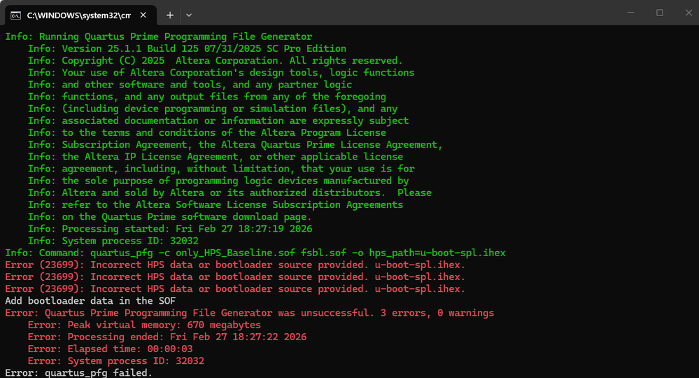 I used the quartus_pfg -c batch processing command to package the sof file and hex file into fsbl.sof. All these files are in the same path. Please refer to the following figure for the batch processing: