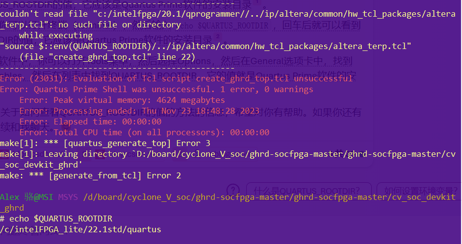 Under SOCEDS v20.1 and Quartus Prime lite 22.1std using MSYS2 running make generate_from_tcl failed duel to the QUARTUS_ROOTDIR error, following is the printscreen of the error: