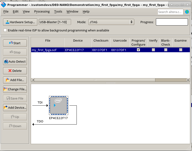 I am trying to use my DE0-Nano board with Quartus version Lite 19.1.0 (Debian 10) and my_first_fpga example, but I cannot achieve to successfully program the FPGA.