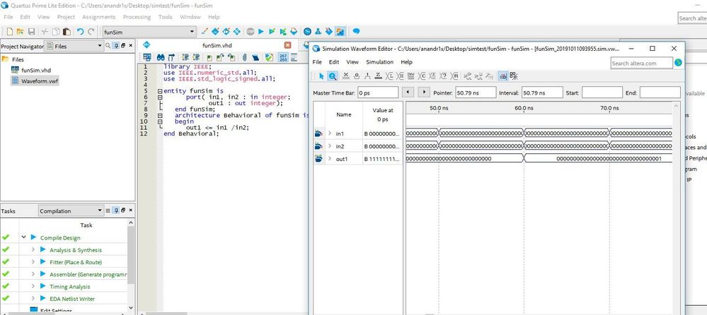 Hi, i have a problem when I want to simulate a programme that is only a division between two integer values. The compilation of the code is correct, but in the simulation appears this error: