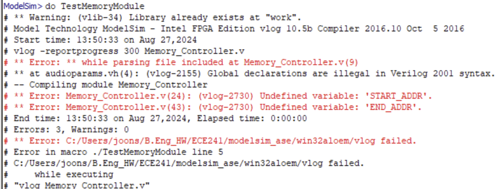 And note that in Memory_Controller.v, I have included the audioparams.vh file. The project compiles without error on Quartus. However, when I attempt to run this TCL script on Modelsim: