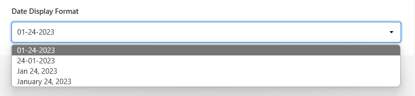 - You can change your date display format by selecting the date formula you would like to use in the Date display format drop down.