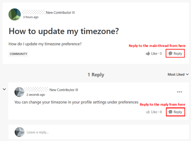 - When you respond to another reply within the discussion, your post is shown indented underneath that reply.