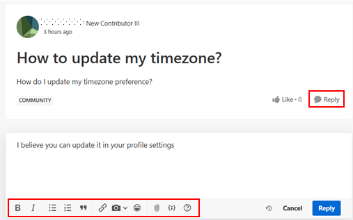 When you click Reply to the topic, the reply box opens directly below the post. Additionally, you can utilize the toolbar to format your reply.