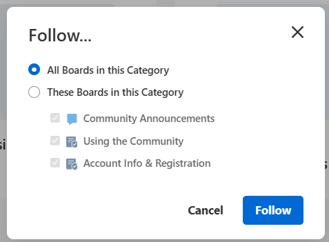 After you have selected the bell icon, you will be given the option to follow all boards in the category or only follow specific boards within the category. If you select All Boards in this Category, you will automatically follow any boards that are added to the category at a later time.