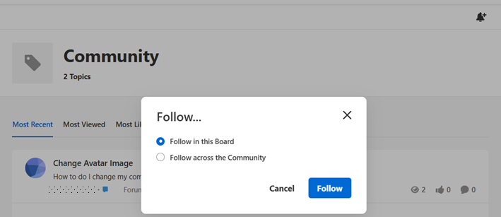 - This will bring up a list of posts with the tag that you have selected. Click the bell icon in the top right corner and select either Follow in this Board or Follow across the Community.