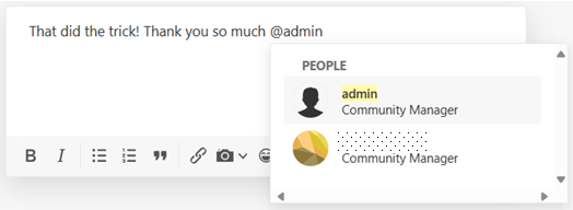 For example, you want to thank a user (admin) for their great answer to a question you asked. After clicking the “Reply” button, enter an "at" symbol (@) followed by their username, “@admin”. As you type, a pop-up menu appears with matching names. You can either continue typing the name or select a name from the list.
